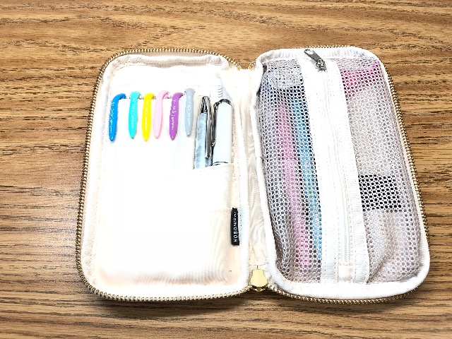 以前は、プチデコラッシュを5個も入れようとすると(他のペン類も一緒に)、それを収められるペンケースといえば、片側がメッシュになったこのちいさいひきだしポーチくらいしかなかったのです。